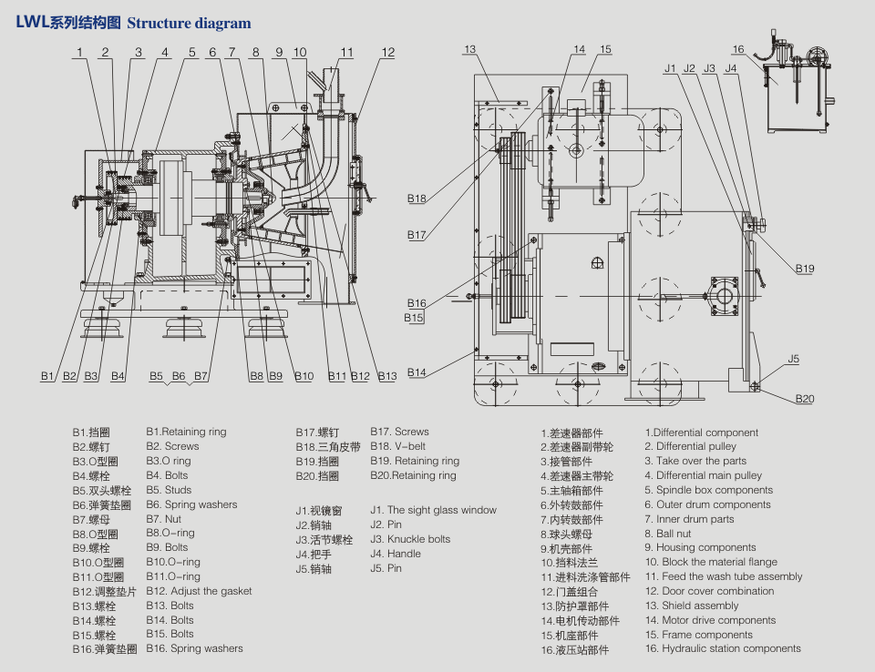 LWL型离心机是一种卧式螺旋卸料、连续操作的过滤设备。转鼓与螺旋以一定差速同向高速旋转,物料由进料管连续引入输料旋内筒,加速后进入转鼓,在离心力场作用下,液相穿过过滤介质排出机外,固相物截留在转鼓内形成滤渣,滤渣在离心力的锥面分力和输料螺旋的共同作用下,连续不断地向转鼓大端移动排出转鼓,经卸料槽排出机外。本机能在全速运转下连续进料、分离、洗涤和卸料。具有结构紧凑、体积小、连续操作、运转平稳、适应性强、处理量大、滤饼含湿率低等特点。